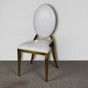 Featuring a sleek gold frame with a beautifully curved backrest, the Dior chair offers a refined silhouette that complements a wide variety of event styles—from romantic and opulent to clean and contemporary. The crisp white padded seat adds both comfort and contrast, making the chair not only visually stunning but also practical for long events where guest comfort is key.
